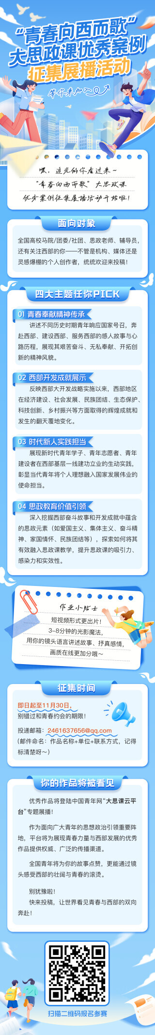 即日起至11月30日,活動參與者可將視頻作品和報名資料投遞至郵箱2461637656@qq.com(郵件命名:作品名稱+單位+聯(lián)系方式)。征集到的優(yōu)秀案例作品,經(jīng)篩選后,將在中國青年網(wǎng)重點打造的“大思政課云平臺”進行專題展播。該平臺作為面向廣大青年進行思想政治引領的重要陣地,將為這些展現(xiàn)青春力量與西部發(fā)展的優(yōu)秀作品提供權威、廣泛的傳播渠道。